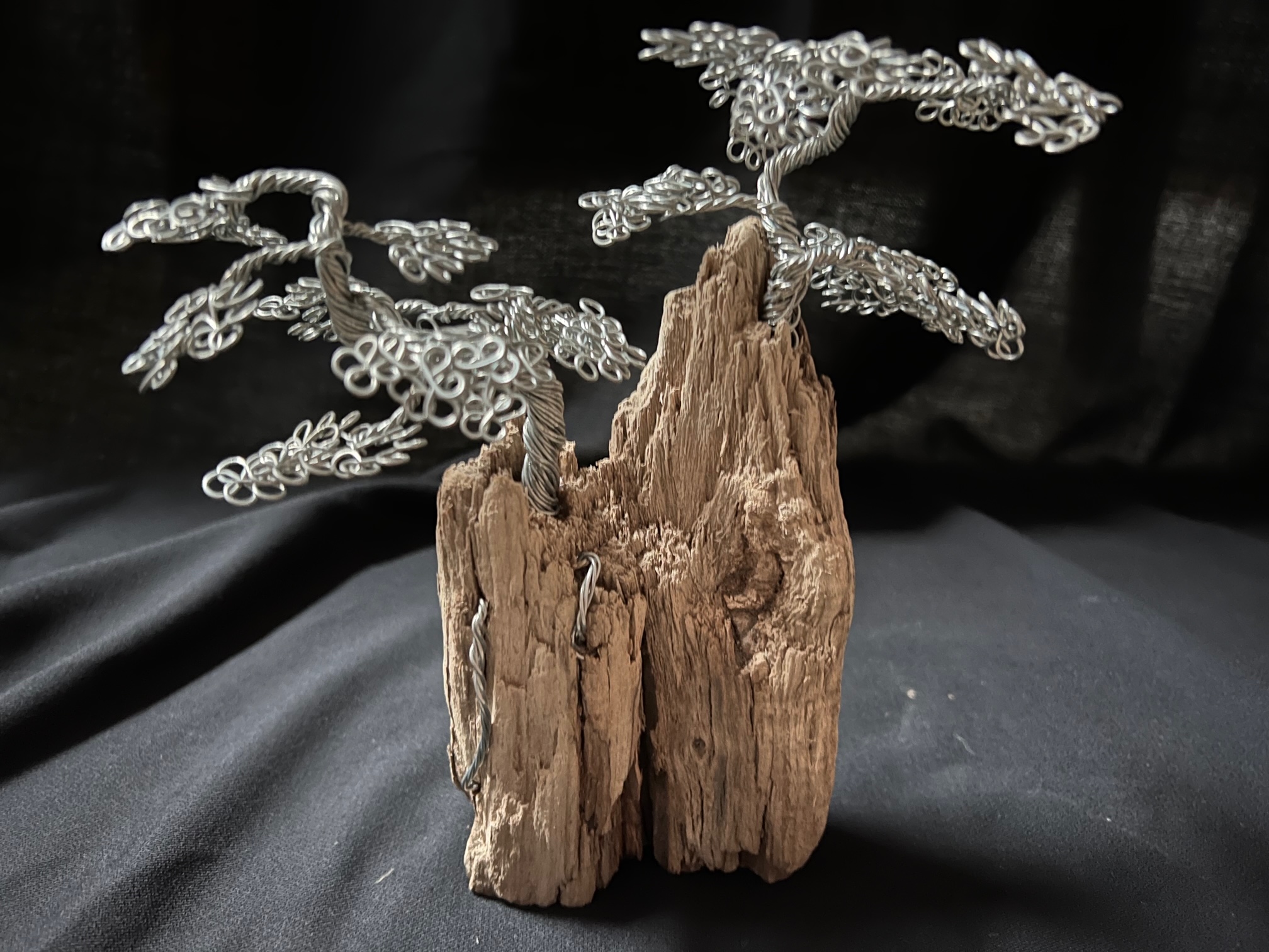 After 45 years as a professional musician, 26 years of teaching, various shorter careers in carpentry and the culinary world, Phil and his wonderful wife Carol decided retirement would look good on them. Plans were made – see the world, travel the country in their camper and enjoy each other. Then things changed for everyone. We still got to enjoy each other but in the comfort of our home. We were grateful. We knew we were some of the lucky ones. We, like everyone else that could, hunkered down and found new ways to spend time. Carol got back into sewing and became the jigsaw puzzle master that she remains to this day. Phil had always liked to work with his hands and make things, set up a woodworking shop in their garage. While looking for a special gift to make Carol, he discovered wire trees (thank you YouTube). Creating these trees from pieces of wire soon became how Phil would spend most of his time – learning and developing new techniques through experimentation. Through this experimentation the idea was born to wed the trees to pieces of driftwood Phil & Carol had been collecting for years…..so the trees married the driftwood and they continue to grow and live happily ever after. Then came Phil’s desire to stay connected to music in some way as a maker. He made his first guitar stand out of a piece of mahogany that had been following him around for 35 years. So after family and friends telling him to get moving and sell these works of art, Phil is going for it. We had our first successful show on beautiful Islesboro, Maine at the end of July. In a few days our website Woodandwire.me will be born. It will show current inventory as well as information on commissioning pieces. We hope you enjoy the site.
